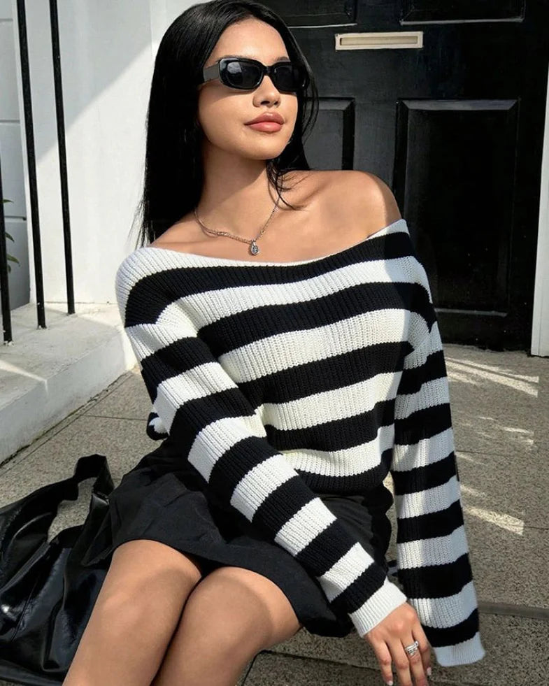 Womens Crew Neck Long Sleeve Plaid Ribbed Knit Loose Pullover Sweater Tops