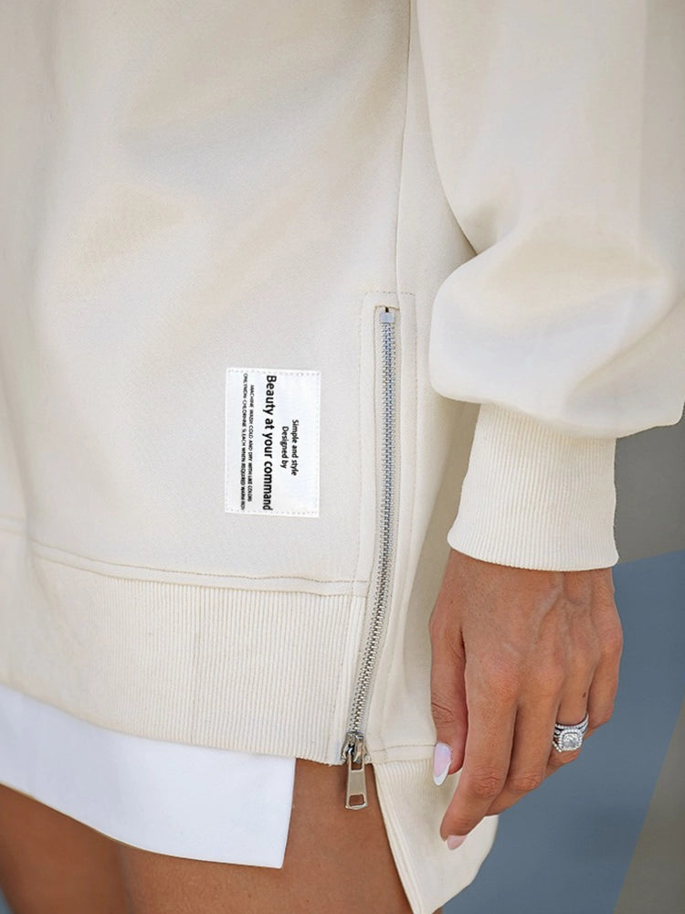 Long Sleeve Drop Shoulder Pullover Casual Zipper Side Slit Top